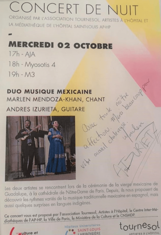 Depuis 2018 en parallèle à mon activité de pédagogue, je me produis régulièrement en tant que chanteuse à Paris principalement avec « L’Association Tournesol, artistes à l’hôpital ». Depuis 1990, cette association fait partie du réseau régional Culture et Santé en Île-de-France et offre aux « personnes hospitalisées ou isolées, des moments artistiques riches en émotion ». Je fais partie d’un réseau de 160 artistes avec un programme de musique espagnole, mexicaine et latino-américaine, accompagné à la guitare par Andrés Izurieta et Javier Santaella.