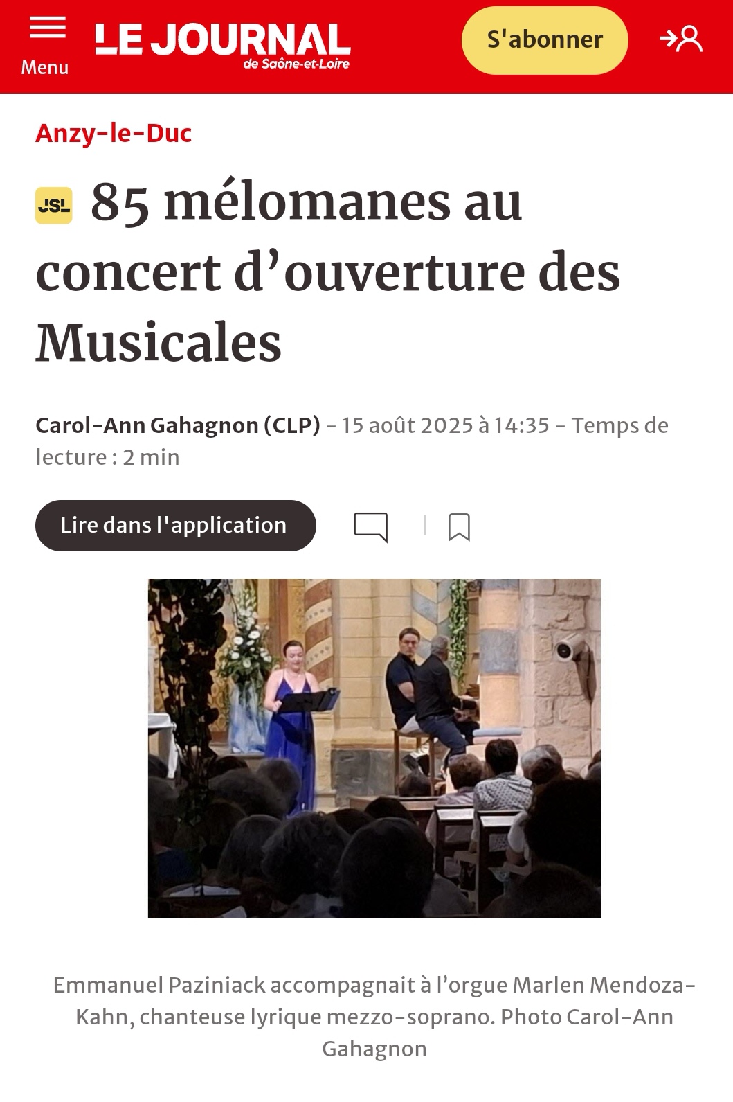 ORGUE et SOPRANO 14/08/2025 Par Emmanuel PAZINIACK et Marlen MENDOZA-KAHN La voix (et quelle voix) et l'orgue, un mariage de timbre resté le même depuis presque mille ans. Belle complicité entre Marlen et Emmanuel qui nous ont fait voyager autour d'un répertoire sacré éternel : hildegard von Bingen, Bach, Mozart, Fauré....A noter la participation "surprise" de la Chorale de Paray Le Monial ! https://festival-musical-a-anzy-le-duc.jimdosite.com/galerie/